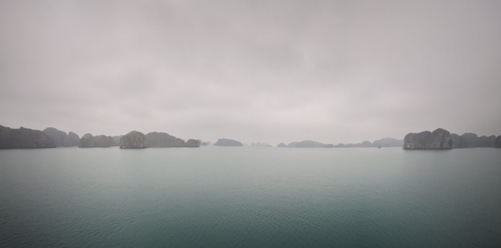 Legend has it that dragons came down to protect the people of this area from foreign invaders and that is why the bay is called “Ha Long” (Descending Dragons). The karst camel humps across the water look like the petrified undulating bodies of legendary creatures that passed away centuries ago. This sea of tombstones is shrouded with misty dust-sheets, like the furnishings of a stately home in the wake of the passing of the previous inhabitant. What will remain and what will go; what will be revitalised and what will be broken up; what will be brought forward and what will be left behind; what will be repurposed and what will be discarded? Now is not the time to decide. Now is the time to acknowledge the passing and to allow the dust to fully settle.